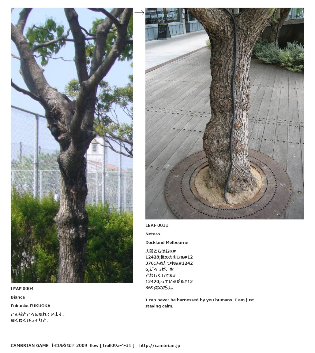LEAF 0004BiancaFukuoka FUKUOKAこんなところに隠れています。細く長くひっそりと。LEAF 0031NetaroDockland Melbourne人間どもはおれ様の力を封じ込めたつもりだろうが、おとなしくしてやっているだけなのだよ。I can never be harnessed by you humans. I am just staying calm.